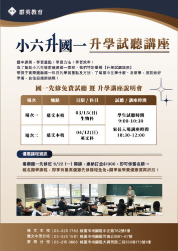 為了幫助小六生提前適應國一課程,我們特別舉辦【升學試聽講座】,